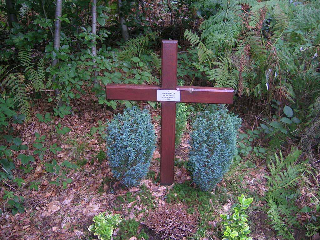 Cette croix en bois verni a été érigée à la mémoire de Léon Jabobi, tué par une branche à cet endroit le 2 février 2002, à l’âge de 65 ans.