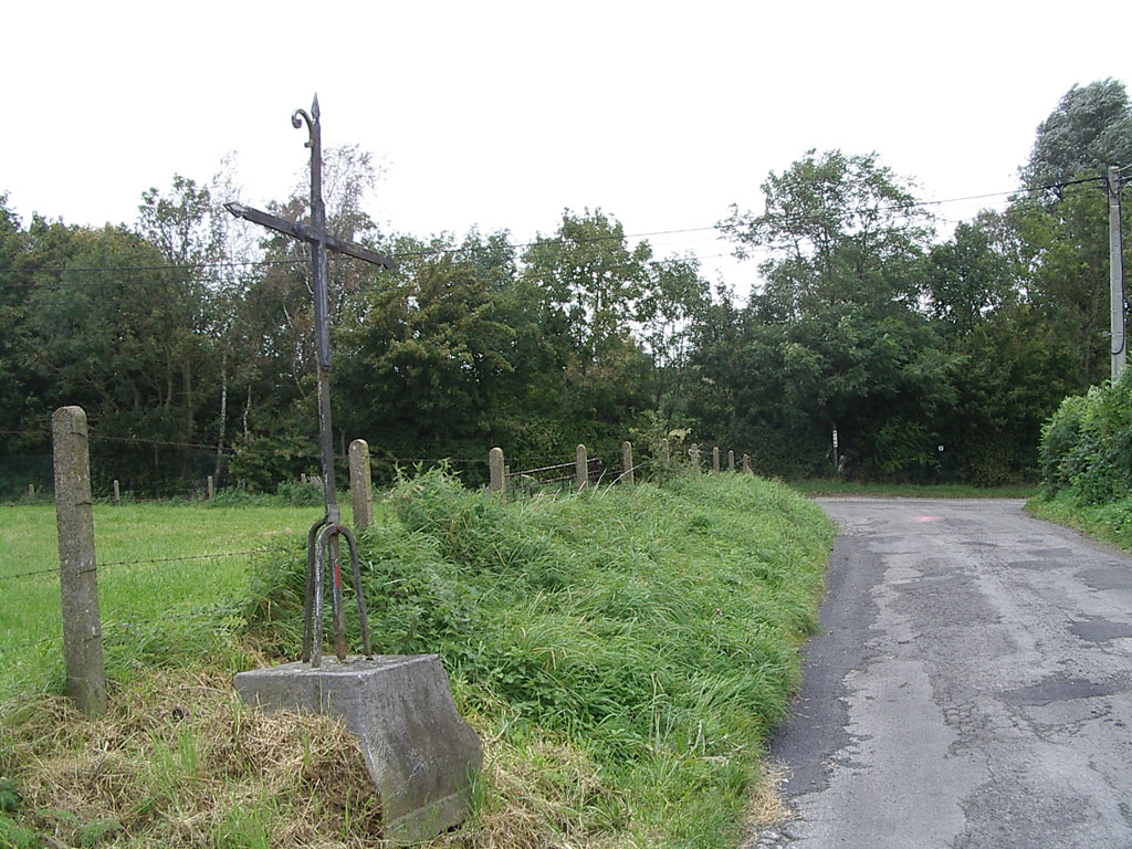 Cette croix en calcaire, dominant le hameau et visible de la ville de Herve, sur un haut socle carré à large base circulaire porte I’inscription : VOVS. QVI.ICI/PASSEZ.PRIEZ/POVR.LES.TRE/ PASSEZ.1739.
