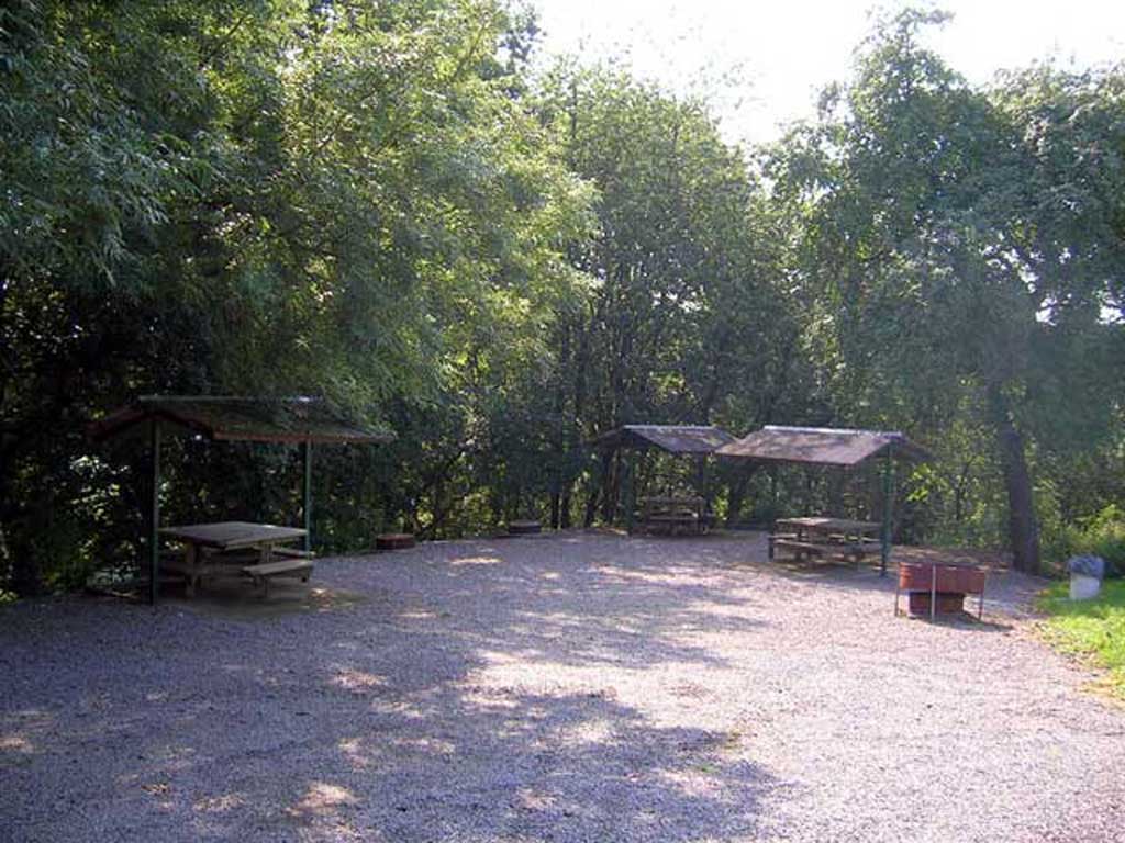 Une aire de barbecue en retrait du village avec 3 tables de pique-nique.