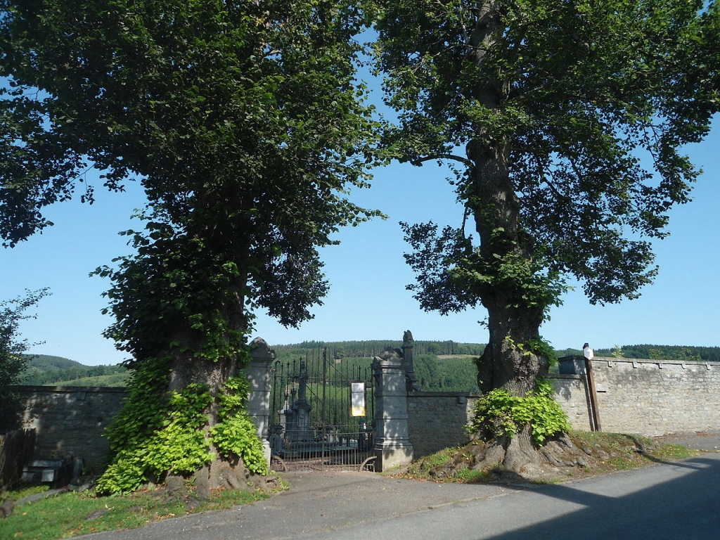Deze driehonderd jaar oude lindebomen staan aan weerszijden van de toegangspoort tot de Moustier begraafplaats.