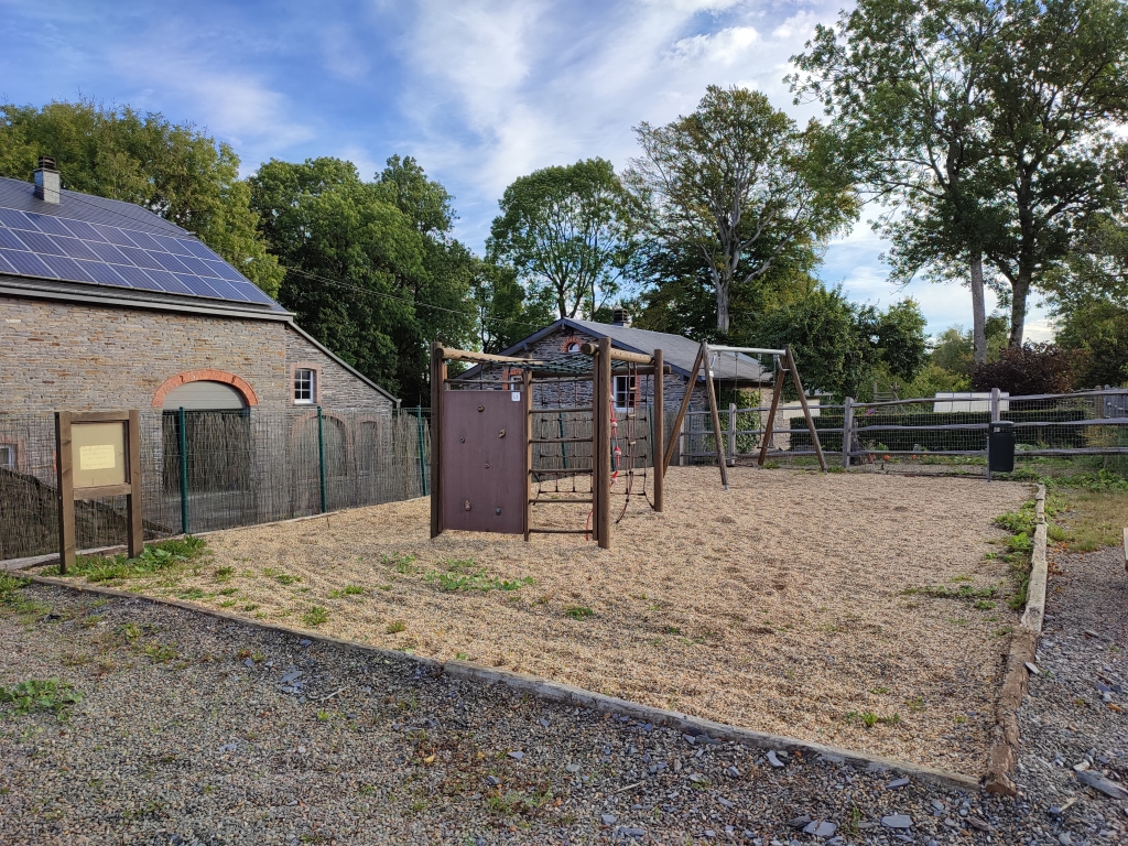 Une petite plaine de jeu très récente et moderne en face de l’église, dont le sol est constitué de dalles en matière molle.