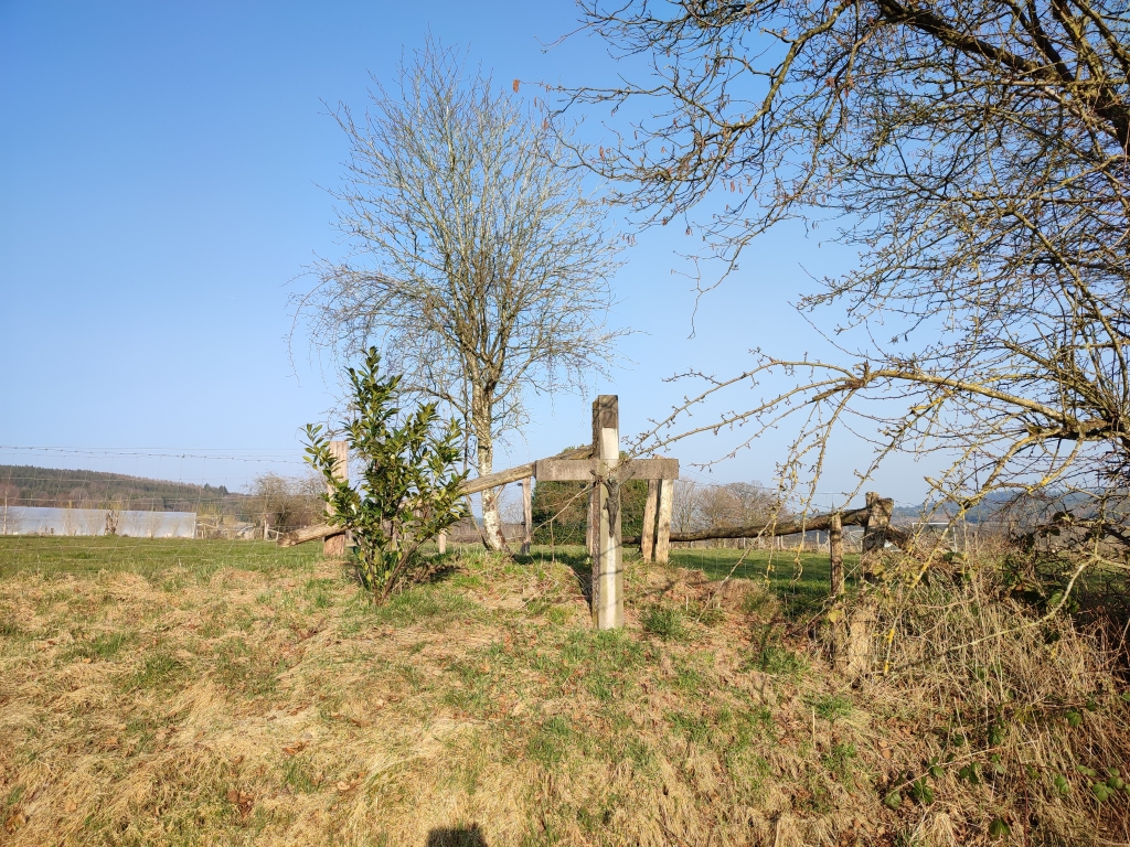 Une petite croix en bois entre deux arbres en sortie sud du village, face à un panorama sur la vallée de la Salm.