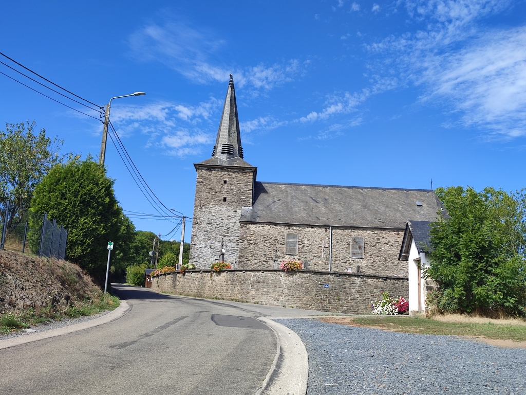 Deze leistenen kerk werd in de 15e eeuw gebouwd door de monniken van Houffalize. Het zou een ouder gebouw uit de Karolingische tijd vervangen. De klokkentoren met kleine opening suggereert dat het versterkt was.