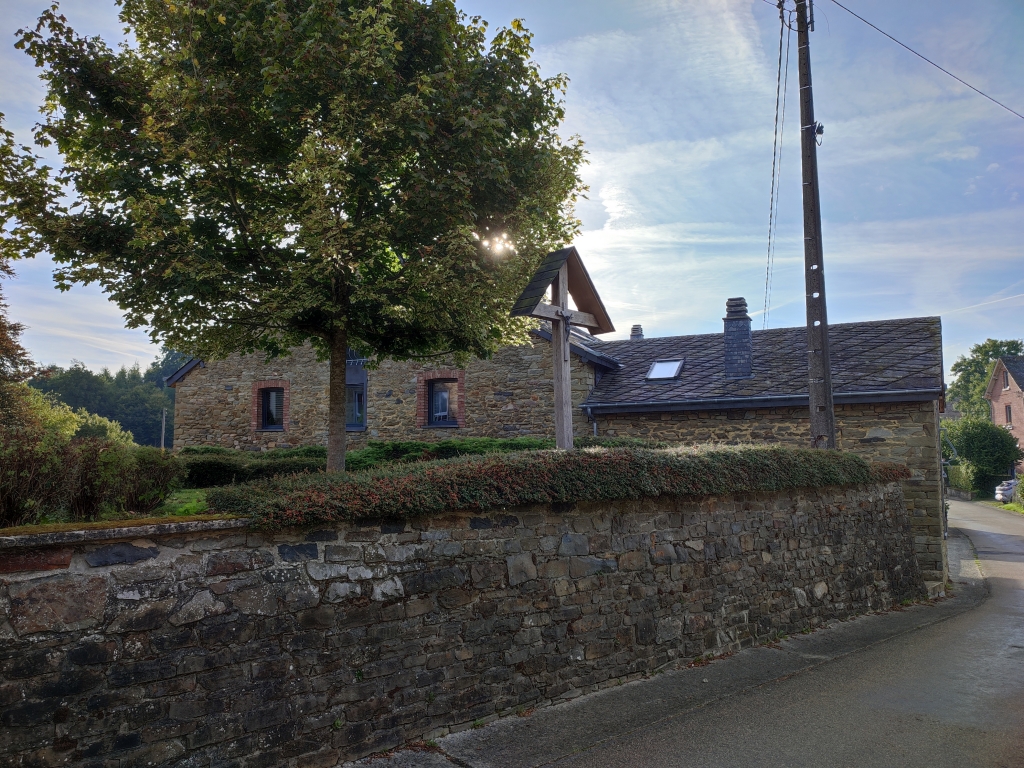 Il s’agit d’une croix de mission blanche, au pied d’un groupe d’épicéas, située à la sortie ouest du village, en face d’une grosse ferme.
