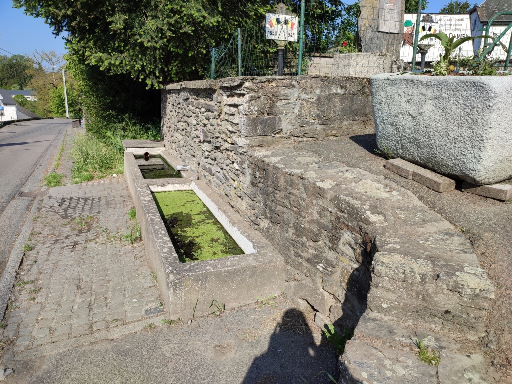En contrebas de l’église et du monument aux morts, une fontaine avec 2 bacs abreuvoirs en pierre de taille en bordure de route.