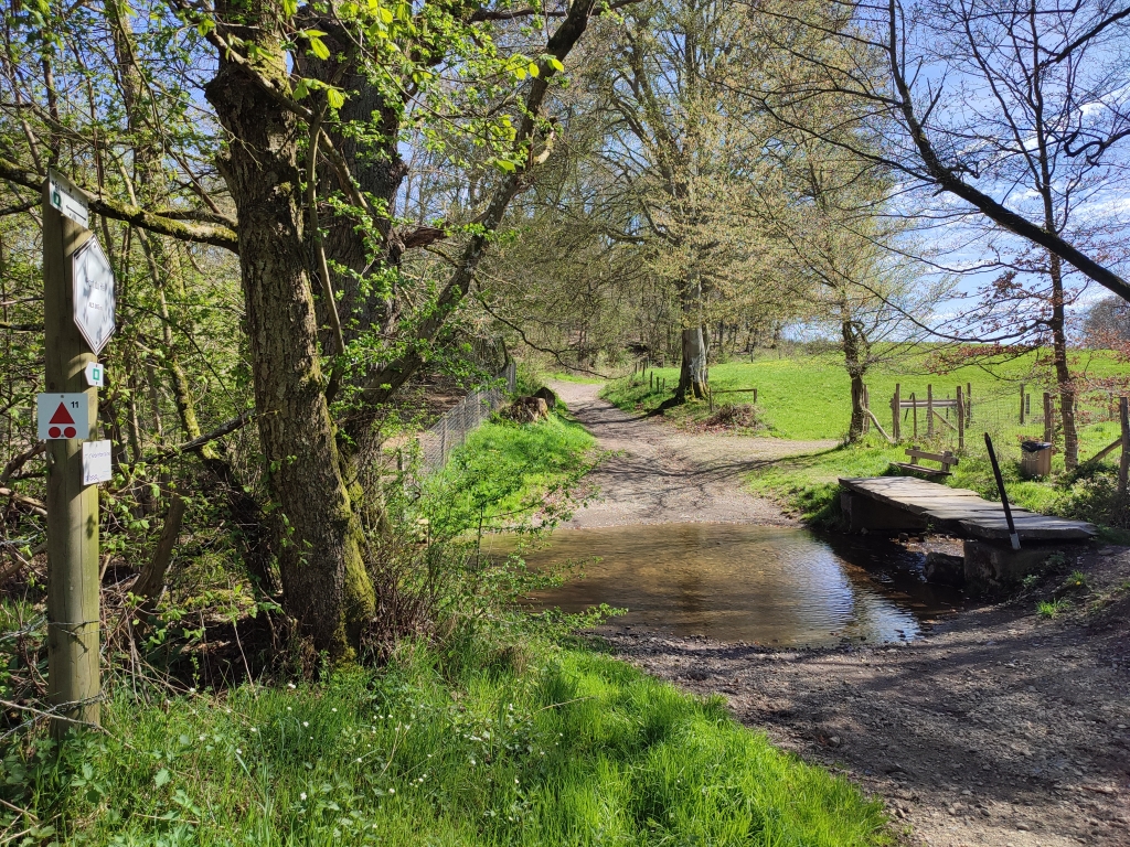 Een loopbrug van grote platen over de Ruisseau d’Arbrefontaine, een zijrivier van de Lienne.