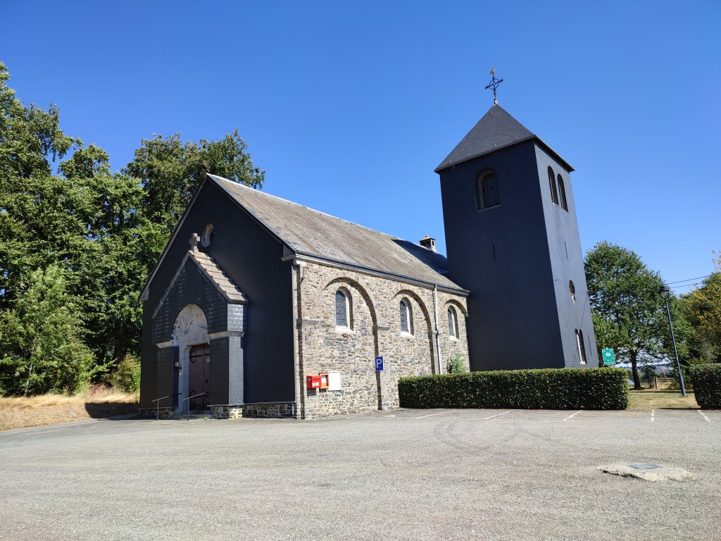 Une petite chapelle en moellons de schiste et à la façade d’entrée blanchie, en face du monument Xavier Henrard.